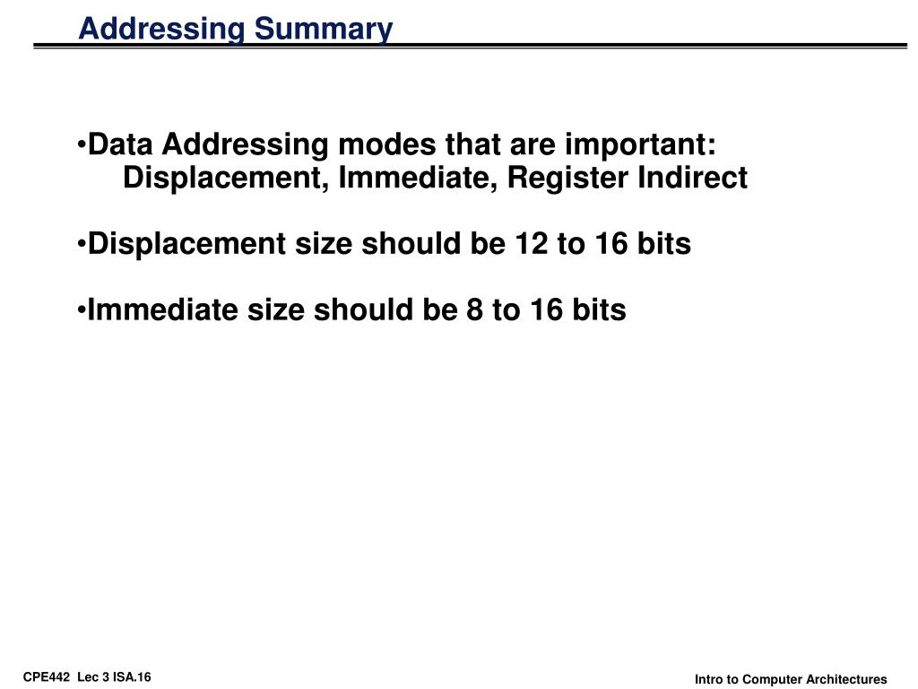 Addressing Summary • Data Addressing modes that are important: • Displacement, Immediate, Register Indirect • Displacement size should be 12 to 16 bits • Immediate size should be 8 to 16 bits