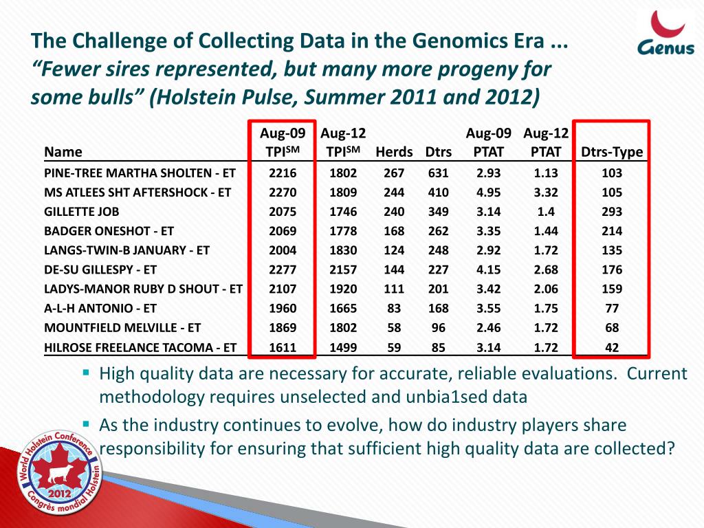 The Challenge of Collecting Data in the Genomics Era ...“Fewer sires represented, but many more progeny for some bulls” (Holstein Pulse, Summer 2011 and 2012) • High quality data are necessary for accurate, reliable evaluations. Current methodology requires unselected and unbia1sed data • As the industry continues to evolve, how do industry players share responsibility for ensuring that sufficient high quality data are collected?