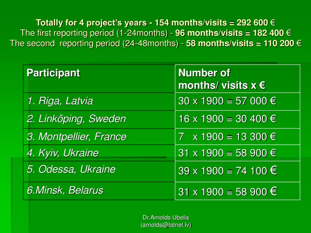 Totally for 4 project’s years - 154 months/visits = 292 600 €The first reporting period (1-24months) - 96 months/visits = 182 400 €The second reporting period (24-48months) - 58 months/visits = 110 200 € Dr.Arnolds Ubelis (arnolds@latnet.lv)