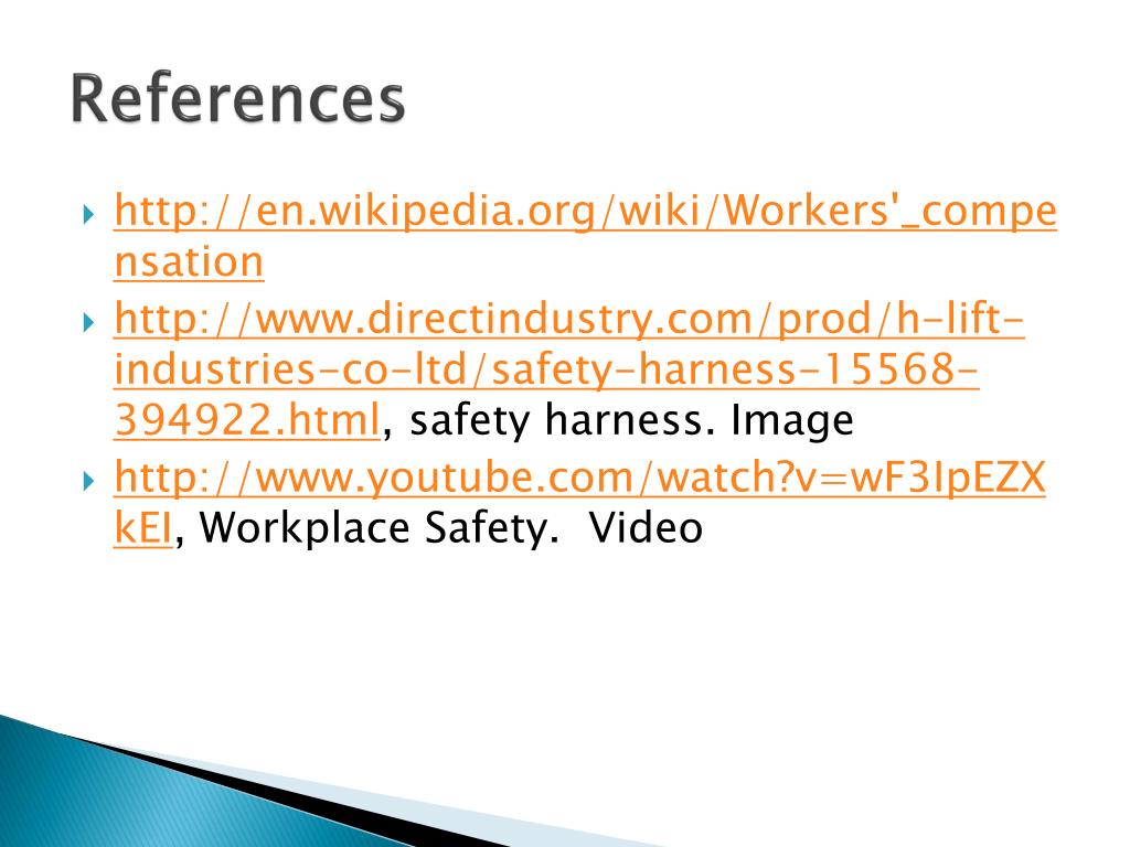 References • http://en.wikipedia.org/wiki/Workers'_compensation • http://www.directindustry.com/prod/h-lift-industries-co-ltd/safety-harness-15568-394922.html, safety harness. Image • http://www.youtube.com/watch?v=wF3IpEZXkEI, Workplace Safety. Video