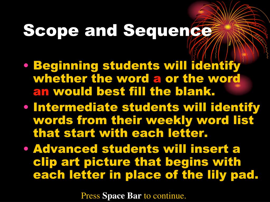 Scope and Sequence • Beginning students will identify whether the word a or the word an would best fill the blank. • Intermediate students will identify words from their weekly word list that start with each letter. • Advanced students will insert a clip art picture that begins with each letter in place of the lily pad. Press Space Bar to continue.