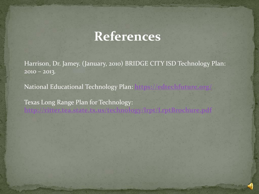 References Harrison, Dr. Jamey. (January, 2010) BRIDGE CITY ISD Technology Plan: 2010 – 2013. National Educational Technology Plan: https://edtechfuture.org/ Texas Long Range Plan for Technology: http://ritter.tea.state.tx.us/technology/lrpt/LrptBrochure.pdf