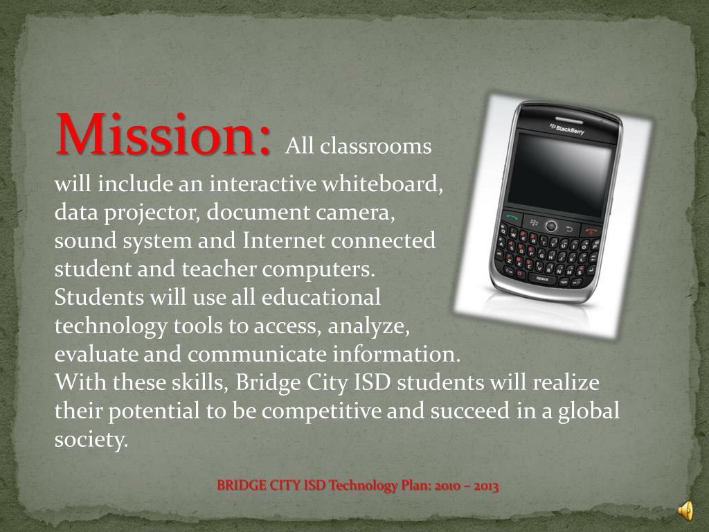 Mission:All classrooms will include aninteractive whiteboard, data projector, document camera, sound system and Internet connected student and teacher computers. Students will use all educational technology tools to access, analyze, evaluate and communicate information. With these skills, Bridge City ISD students will realize their potential to be competitive and succeed in a global society. BRIDGE CITY ISD Technology Plan: 2010 – 2013