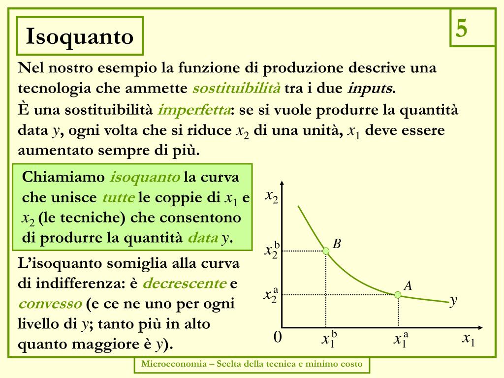x1 x2 x1 x2 b a a b 5 Isoquanto Nel nostro esempio la funzione di produzione descrive una tecnologia che ammette sostituibilità tra i due inputs. È una sostituibilità imperfetta: se si vuole produrre la quantità data y, ogni volta che si riduce x2 di una unità, x1 deve essere aumentato sempre di più. Chiamiamo isoquanto la curva che unisce tutte le coppie di x1 e x2(le tecniche) che consentono di produrre la quantità datay. x2 B L’isoquanto somiglia alla curva di indifferenza: è decrescente e convesso (e ce ne uno per ogni livello di y; tanto più in alto quanto maggiore è y). A y 0 x1 Microeconomia – Scelta della tecnica e minimo costo