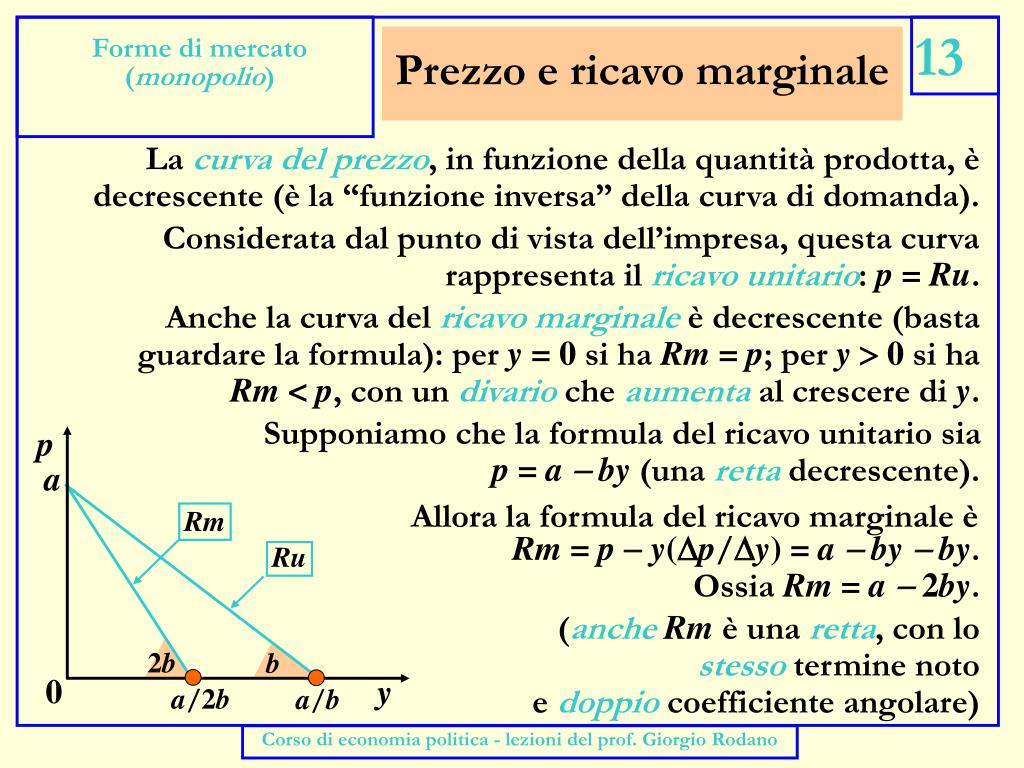 Ricavo marginalee monopolio 12 Forme di mercato (monopolio) Sceglierà la quantitày (e di conseguenza il prezzo p) che rende massimo il suo profitto, ossia la quantità identificata dalla solita condizioneRm = Cm. Corso di economia politica - lezioni del prof. Giorgio Rodano Abbiamo visto che l’impresa può scegliere qualunque punto (combinazione di y e p) sulla curva di domanda. Quale sceglierà? Questa volta, però, il ricavo marginale non coincide col prezzo. Se vuole vendere una unità in più, l’impresa deve vendere tutta la sua produzione a un prezzo più basso. Perciò il ricavo che ottiene da quella unità in più (appunto il ricavo marginale) è dato dal prezzo incassato su quell’ultima unità meno il minor prezzo su tutte le unità precedenti. La formula corrispondente è Rm = p-y(Dp/Dy) La dimensione del minor prezzo dipende dall’inclinazione della curva di domanda, ossia, appunto da Dp/Dy.