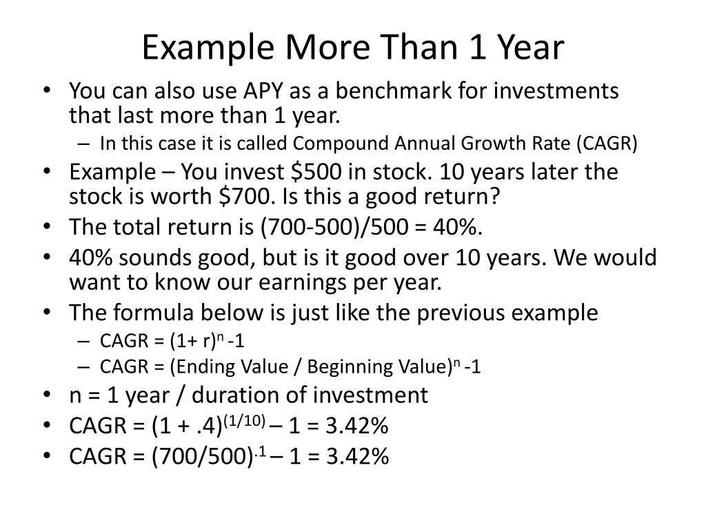 Example More Than 1 Year • You can also use APY as a benchmark for investments that last more than 1 year. • In this case it is called Compound Annual Growth Rate (CAGR) • Example – You invest $500 in stock. 10 years later the stock is worth $700. Is this a good return? • The total return is (700-500)/500 = 40%. • 40% sounds good, but is it good over 10 years. We would want to know our earnings per year. • The formula below is just like the previous example • CAGR = (1+ r)n -1 • CAGR = (Ending Value / Beginning Value)n -1 • n = 1 year / duration of investment • CAGR = (1 + .4)(1/10) – 1 = 3.42% • CAGR = (700/500).1 – 1 = 3.42%
