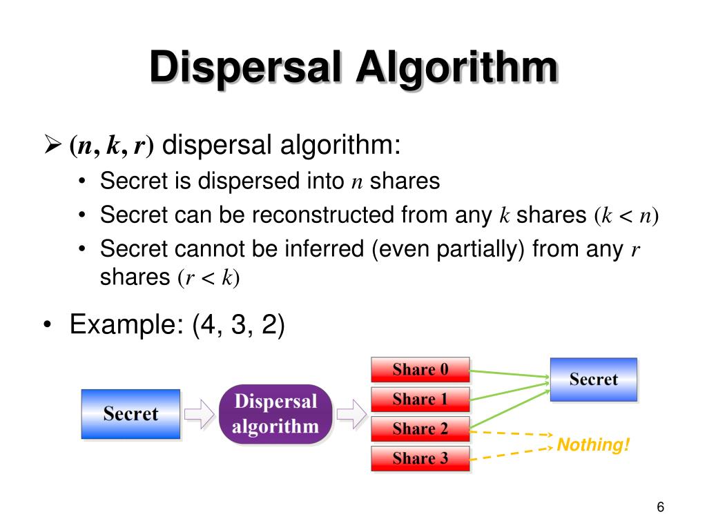 Dispersal Algorithm • (n, k, r) dispersal algorithm: • Secret is dispersed into n shares • Secret can be reconstructed from any k shares (k < n) • Secret cannot be inferred (even partially) from any r shares (r < k) • Example: (4, 3, 2) Nothing!