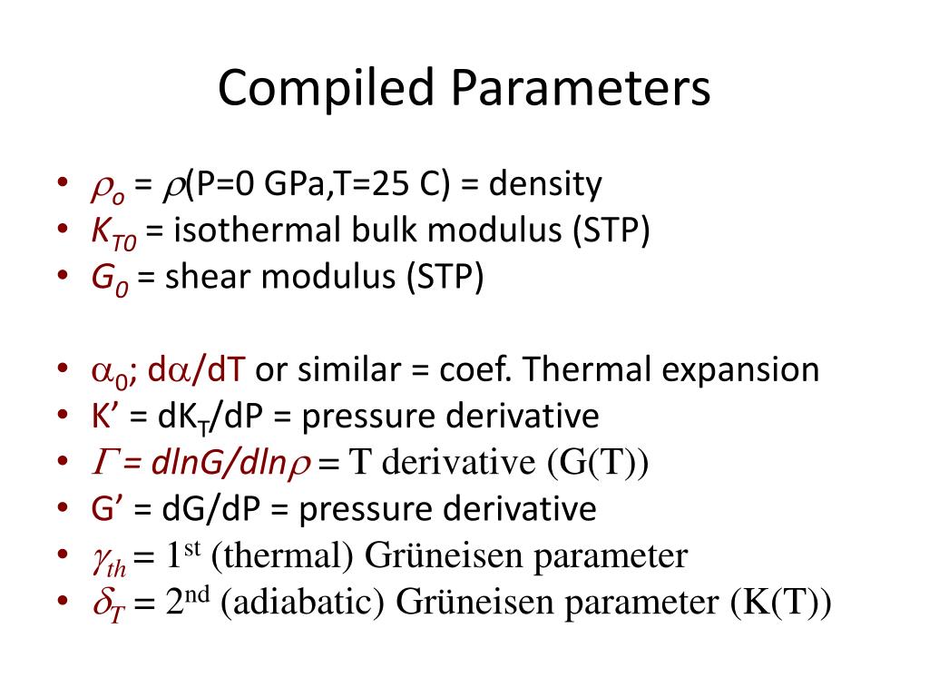 Compiled Parameters • ro=r(P=0 GPa,T=25 C) = density • KT0 = isothermal bulk modulus (STP) • G0= shear modulus (STP) • a0; da/dTor similar = coef. Thermal expansion • K’ = dKT/dP = pressure derivative • G = dlnG/dlnr= T derivative (G(T)) • G’ = dG/dP = pressure derivative • gth= 1st (thermal) Grüneisen parameter • dT = 2nd (adiabatic) Grüneisen parameter (K(T))