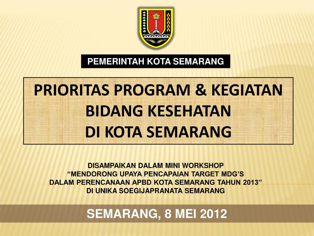 PEMERINTAH KOTA SEMARANG PRIORITAS PROGRAM & KEGIATAN BIDANG KESEHATAN DI KOTA SEMARANG DISAMPAIKAN DALAM MINI WORKSHOP “MENDORONG UPAYA PENCAPAIAN TARGET MDG’S DALAM PERENCANAAN APBD KOTA SEMARANG TAHUN 2013” DI UNIKA SOEGIJAPRANATA SEMARANG SEMARANG, 8 MEI 2012