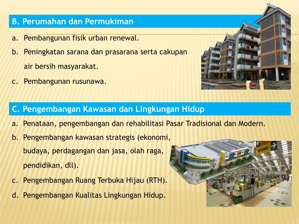 B. Perumahan dan Permukiman • Pembangunan fisik urban renewal. • Peningkatan sarana dan prasarana serta cakupan air bersih masyarakat. • Pembangunan rusunawa. C. Pengembangan Kawasan dan Lingkungan Hidup Penataan, pengembangan dan rehabilitasi Pasar Tradisional dan Modern. Pengembangan kawasan strategis (ekonomi, budaya, perdagangan dan jasa, olah raga, pendidikan,dll). Pengembangan Ruang Terbuka Hijau (RTH). Pengembangan Kualitas Lingkungan Hidup.