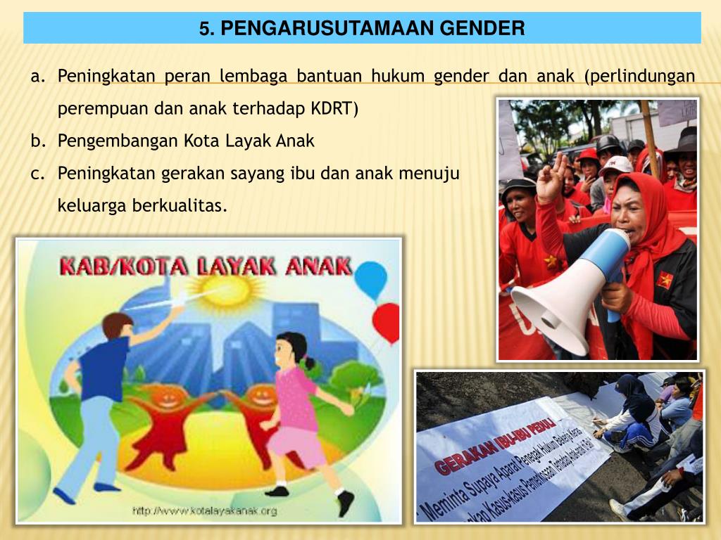 5.PENGARUSUTAMAAN GENDER Peningkatan peran lembaga bantuan hukum gender dan anak (perlindungan perempuan dan anak terhadap KDRT) Pengembangan Kota Layak Anak Peningkatan gerakan sayang ibu dan anak menuju keluarga berkualitas.