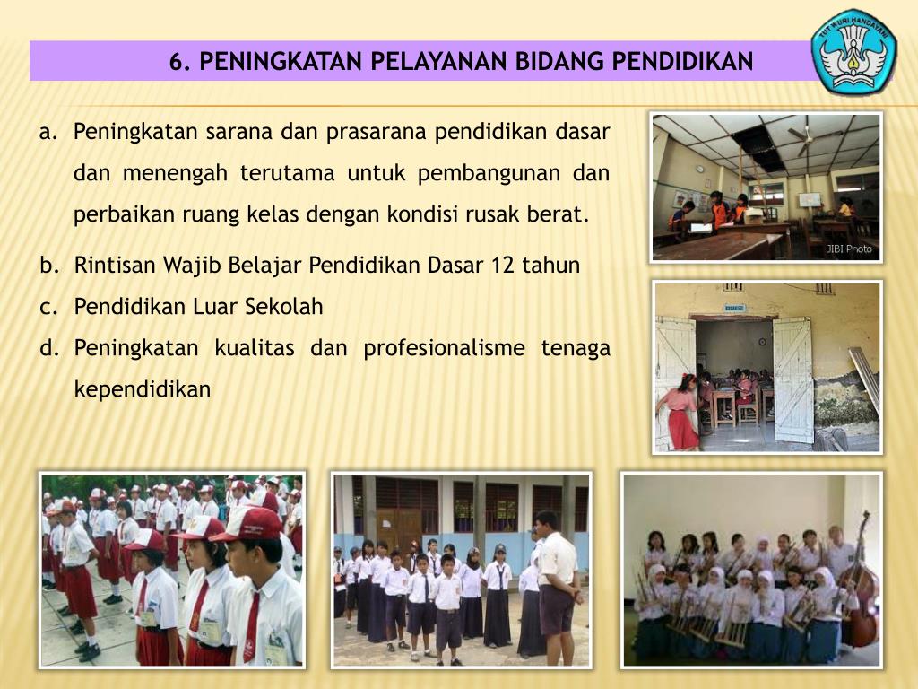 6. PENINGKATAN PELAYANAN BIDANG PENDIDIKAN Peningkatan sarana dan prasarana pendidikan dasar dan menengah terutama untuk pembangunan dan perbaikan ruang kelas dengan kondisi rusak berat. Rintisan Wajib Belajar Pendidikan Dasar 12 tahun Pendidikan Luar Sekolah Peningkatan kualitas dan profesionalisme tenaga kependidikan
