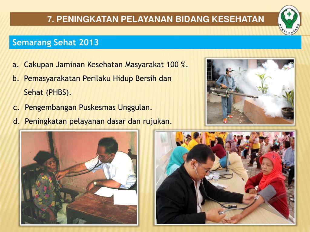 7.PENINGKATAN PELAYANAN BIDANG KESEHATAN Semarang Sehat 2013 Cakupan Jaminan Kesehatan Masyarakat 100 %. Pemasyarakatan Perilaku Hidup Bersih dan Sehat (PHBS). Pengembangan Puskesmas Unggulan. Peningkatan pelayanan dasar dan rujukan.