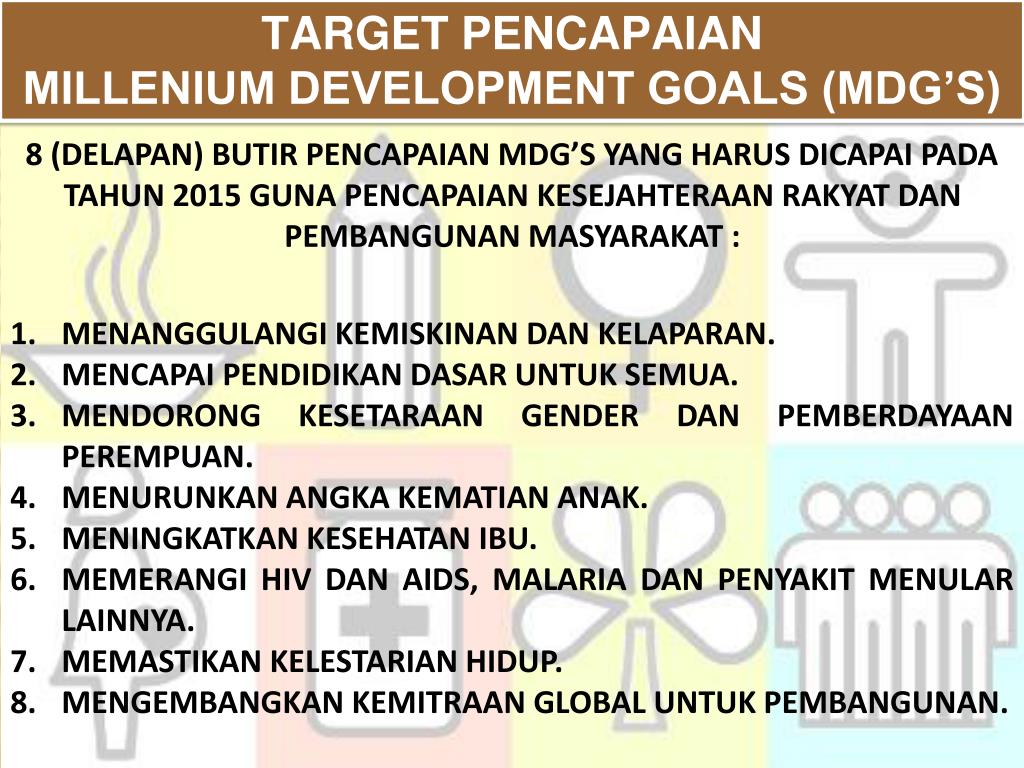 TARGET PENCAPAIAN MILLENIUM DEVELOPMENT GOALS (MDG’S) 8 (DELAPAN) BUTIR PENCAPAIAN MDG’S YANG HARUS DICAPAI PADA TAHUN 2015 GUNA PENCAPAIAN KESEJAHTERAAN RAKYAT DAN PEMBANGUNAN MASYARAKAT : • MENANGGULANGI KEMISKINAN DAN KELAPARAN. • MENCAPAI PENDIDIKAN DASAR UNTUK SEMUA. • MENDORONG KESETARAAN GENDER DAN PEMBERDAYAAN PEREMPUAN. • MENURUNKAN ANGKA KEMATIAN ANAK. • MENINGKATKAN KESEHATAN IBU. • MEMERANGI HIV DAN AIDS, MALARIA DAN PENYAKIT MENULAR LAINNYA. • MEMASTIKAN KELESTARIAN HIDUP. • MENGEMBANGKAN KEMITRAAN GLOBAL UNTUK PEMBANGUNAN.
