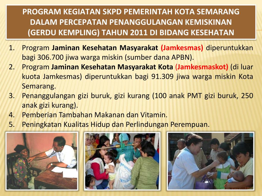 PROGRAM KEGIATAN SKPD PEMERINTAH KOTA SEMARANG DALAM PERCEPATAN PENANGGULANGAN KEMISKINAN (GERDU KEMPLING) TAHUN 2011DI BIDANG KESEHATAN • Program Jaminan Kesehatan Masyarakat (Jamkesmas)diperuntukkan bagi 306.700 jiwa warga miskin (sumber dana APBN). • Program Jaminan Kesehatan Masyarakat Kota(Jamkesmaskot)(di luar kuota Jamkesmas) diperuntukkanbagi 91.309 jiwa warga miskin Kota Semarang. • Penanggulangan gizi buruk, gizi kurang (100 anak PMT gizi buruk, 250 anak gizi kurang). • Pemberian Tambahan Makanan dan Vitamin. • Peningkatan Kualitas Hidup dan Perlindungan Perempuan.