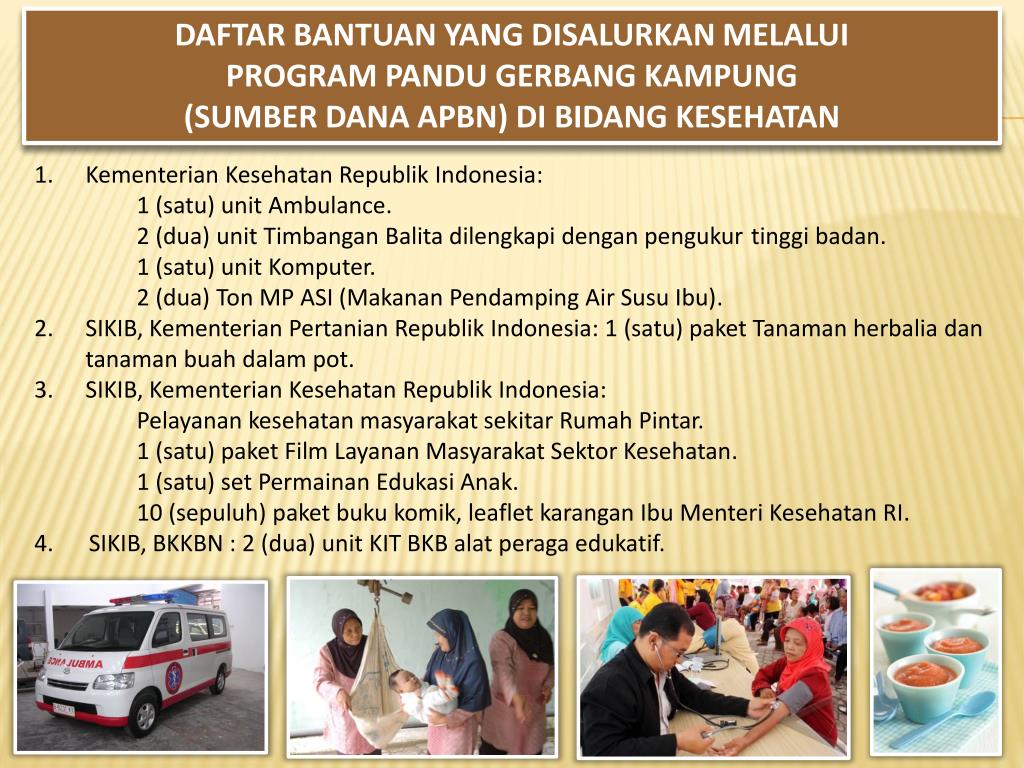 DAFTAR BANTUAN YANG DISALURKAN MELALUI PROGRAM PANDU GERBANG KAMPUNG (SUMBER DANA APBN) DI BIDANG KESEHATAN • Kementerian Kesehatan Republik Indonesia: • 1 (satu) unit Ambulance. • 2 (dua) unit Timbangan Balita dilengkapi dengan pengukur tinggi badan. • 1 (satu) unit Komputer. • 2 (dua) Ton MP ASI (Makanan Pendamping Air Susu Ibu). • SIKIB, Kementerian Pertanian Republik Indonesia: 1 (satu) paket Tanaman herbalia dan tanaman buah dalam pot. • SIKIB, Kementerian KesehatanRepublik Indonesia: • Pelayanan kesehatan masyarakat sekitar Rumah Pintar. • 1 (satu) paket Film Layanan Masyarakat Sektor Kesehatan. • 1 (satu) set Permainan Edukasi Anak. • 10 (sepuluh) paket buku komik, leaflet karangan Ibu Menteri Kesehatan RI. • 4. SIKIB, BKKBN : 2 (dua) unit KIT BKB alat peraga edukatif.