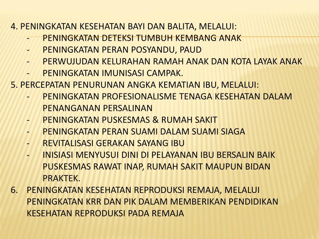 4. PENINGKATAN KESEHATAN BAYI DAN BALITA, MELALUI: - PENINGKATAN DETEKSI TUMBUH KEMBANG ANAK - PENINGKATAN PERAN POSYANDU, PAUD - PERWUJUDAN KELURAHAN RAMAH ANAK DAN KOTA LAYAK ANAK - PENINGKATAN IMUNISASI CAMPAK. 5. PERCEPATAN PENURUNAN ANGKA KEMATIAN IBU, MELALUI: - PENINGKATAN PROFESIONALISME TENAGA KESEHATAN DALAM PENANGANAN PERSALINAN - PENINGKATAN PUSKESMAS & RUMAH SAKIT - PENINGKATAN PERAN SUAMI DALAM SUAMI SIAGA - REVITALISASI GERAKAN SAYANG IBU - INISIASI MENYUSUI DINI DI PELAYANAN IBU BERSALIN BAIK PUSKESMAS RAWAT INAP, RUMAH SAKIT MAUPUN BIDANPRAKTEK. 6. PENINGKATAN KESEHATAN REPRODUKSI REMAJA, MELALUI PENINGKATAN KRR DAN PIK DALAM MEMBERIKAN PENDIDIKAN KESEHATAN REPRODUKSI PADA REMAJA