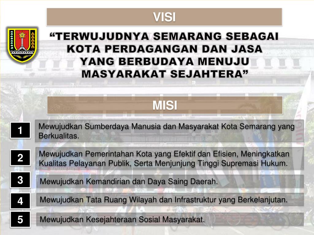 VISI “TERWUJUDNYA SEMARANG SEBAGAI KOTA PERDAGANGAN DANJASA YANG BERBUDAYA MENUJU MASYARAKAT SEJAHTERA” MISI Mewujudkan Sumberdaya Manusia dan Masyarakat Kota Semarang yang Berkualitas. 1 Mewujudkan Pemerintahan Kota yang Efektif dan Efisien, Meningkatkan Kualitas Pelayanan Publik, Serta Menjunjung Tinggi Supremasi Hukum. 2 3 Mewujudkan Kemandirian dan Daya Saing Daerah. 4 Mewujudkan Tata Ruang Wilayah dan Infrastruktur yang Berkelanjutan. 5 Mewujudkan Kesejahteraan Sosial Masyarakat.