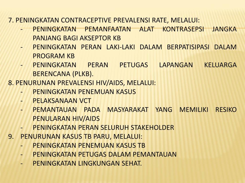 7. PENINGKATAN CONTRACEPTIVE PREVALENSI RATE, MELALUI: • - PENINGKATAN PEMANFAATAN ALAT KONTRASEPSI JANGKA PANJANG BAGI AKSEPTOR KB • - PENINGKATAN PERAN LAKI-LAKI DALAM BERPATISIPASI DALAM PROGRAM KB • - PENINGKATAN PERAN PETUGAS LAPANGAN KELUARGA BERENCANA (PLKB). • 8. PENURUNAN PREVALENSI HIV/AIDS, MELALUI: • - PENINGKATAN PENEMUAN KASUS • - PELAKSANAAN VCT • - PEMANTAUAN PADA MASYARAKAT YANG MEMILIKI RESIKO PENULARAN HIV/AIDS • - PENINGKATAN PERAN SELURUH STAKEHOLDER • PENURUNAN KASUS TB PARU, MELALUI: • - PENINGKATAN PENEMUAN KASUS TB • - PENINGKATAN PETUGAS DALAM PEMANTAUAN • - PENINGKATAN LINGKUNGAN SEHAT.