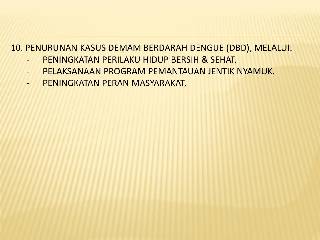 10. PENURUNAN KASUS DEMAM BERDARAH DENGUE (DBD), MELALUI: - PENINGKATAN PERILAKU HIDUP BERSIH & SEHAT. - PELAKSANAAN PROGRAM PEMANTAUAN JENTIK NYAMUK. - PENINGKATAN PERAN MASYARAKAT.