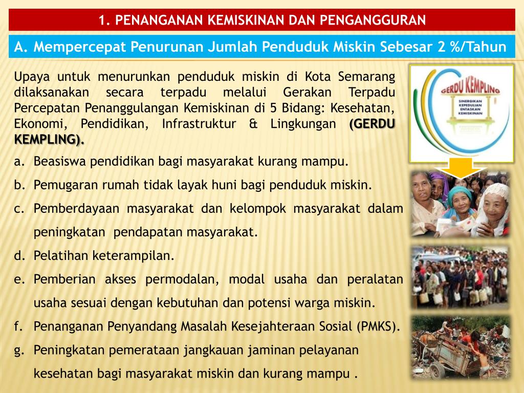 1.PENANGANAN KEMISKINAN DAN PENGANGGURAN Mempercepat Penurunan Jumlah Penduduk Miskin Sebesar 2 %/Tahun Upaya untuk menurunkan penduduk miskin di Kota Semarang dilaksanakan secara terpadu melalui Gerakan Terpadu PercepatanPenanggulangan Kemiskinan di 5 Bidang:Kesehatan, Ekonomi, Pendidikan, Infrastruktur & Lingkungan (GERDU KEMPLING). Beasiswa pendidikan bagi masyarakat kurang mampu. Pemugaran rumah tidak layak huni bagi penduduk miskin. Pemberdayaan masyarakat dan kelompok masyarakat dalam peningkatan pendapatan masyarakat. Pelatihan keterampilan. Pemberian akses permodalan, modal usaha dan peralatan usaha sesuai dengan kebutuhan dan potensi warga miskin. Penanganan Penyandang Masalah Kesejahteraan Sosial (PMKS). Peningkatan pemerataan jangkauan jaminan pelayanan kesehatan bagi masyarakat miskin dan kurang mampu .