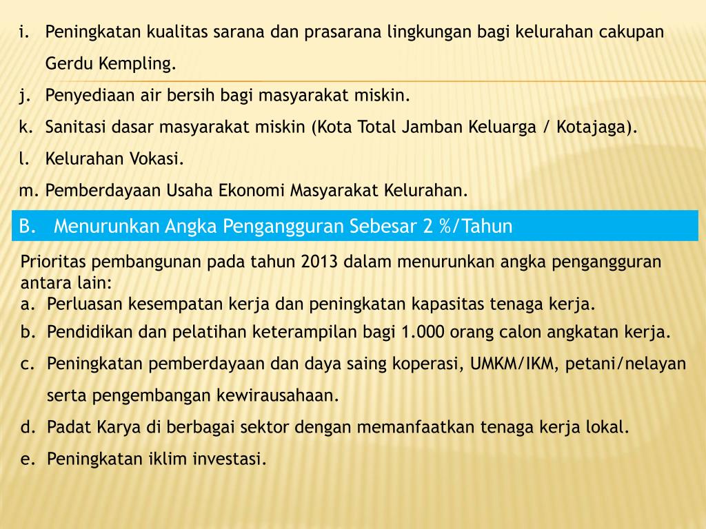Peningkatan kualitas sarana dan prasarana lingkungan bagi kelurahan cakupan Gerdu Kempling. Penyediaan air bersih bagi masyarakat miskin. Sanitasi dasar masyarakat miskin (Kota Total Jamban Keluarga / Kotajaga). Kelurahan Vokasi. Pemberdayaan Usaha Ekonomi Masyarakat Kelurahan. Menurunkan Angka Pengangguran Sebesar2 %/Tahun Prioritaspembangunanpadatahun2013 dalammenurunkanangkapengangguran antaralain: Perluasankesempatankerja dan peningkatankapasitastenagakerja. Pendidikandanpelatihanketerampilanbagi 1.000 orangcalonangkatankerja. Peningkatanpemberdayaandan dayasaingkoperasi, UMKM/IKM,petani/nelayansertapengembangankewirausahaan. PadatKaryadiberbagaisektordengan memanfaatkan tenaga kerja lokal. Peningkatan iklim investasi.