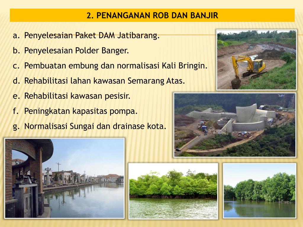 2.PENANGANAN ROB DAN BANJIR Penyelesaian Paket DAM Jatibarang. Penyelesaian Polder Banger. Pembuatan embung dan normalisasi Kali Bringin. Rehabilitasi lahan kawasan Semarang Atas. Rehabilitasi kawasan pesisir. Peningkatan kapasitas pompa. Normalisasi Sungai dan drainase kota.