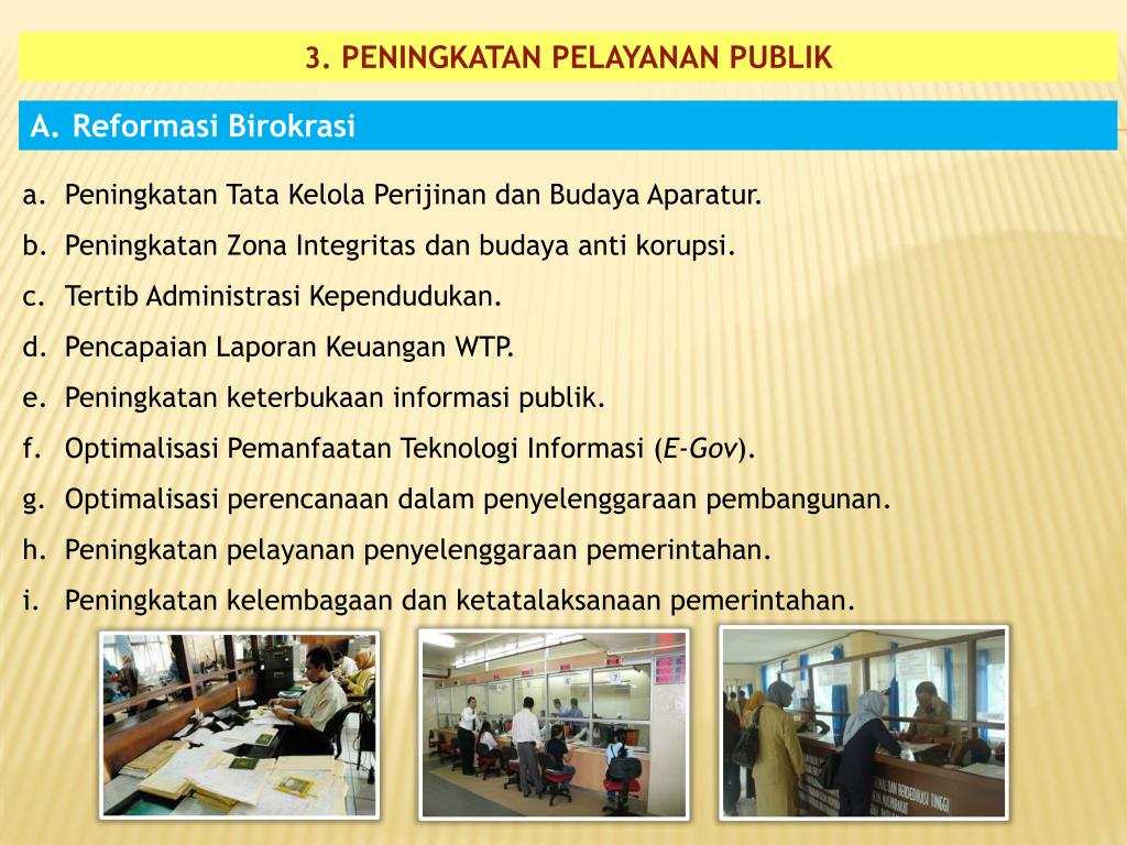 3.PENINGKATAN PELAYANAN PUBLIK Reformasi Birokrasi Peningkatan Tata Kelola Perijinan dan Budaya Aparatur. Peningkatan Zona Integritas dan budaya anti korupsi. Tertib Administrasi Kependudukan. Pencapaian Laporan Keuangan WTP. Peningkatan keterbukaan informasi publik. Optimalisasi Pemanfaatan Teknologi Informasi (E-Gov). Optimalisasi perencanaan dalam penyelenggaraan pembangunan. Peningkatan pelayanan penyelenggaraan pemerintahan. Peningkatan kelembagaan dan ketatalaksanaan pemerintahan.