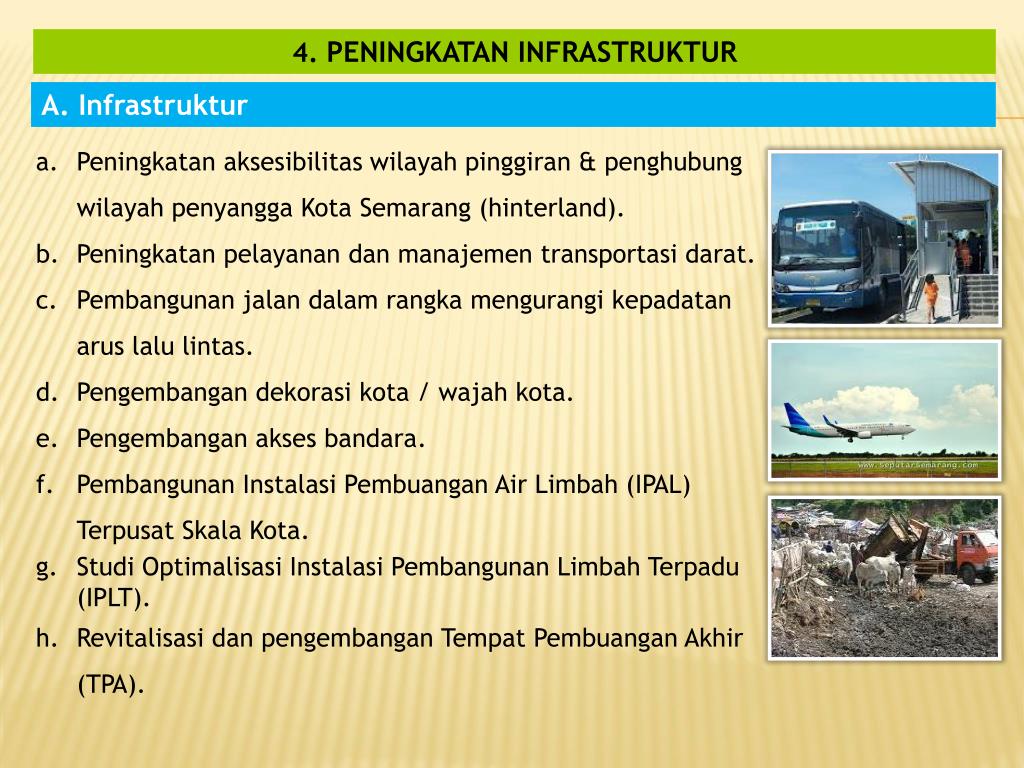 4.PENINGKATAN INFRASTRUKTUR A. Infrastruktur • Peningkatan aksesibilitas wilayah pinggiran & penghubung wilayah penyangga Kota Semarang (hinterland). • Peningkatan pelayanan dan manajemen transportasi darat. • Pembangunan jalan dalam rangka mengurangi kepadatan arus lalu lintas. • Pengembangan dekorasi kota / wajah kota. • Pengembangan akses bandara. • Pembangunan Instalasi Pembuangan Air Limbah (IPAL) Terpusat Skala Kota. • Studi Optimalisasi Instalasi Pembangunan Limbah Terpadu (IPLT). • Revitalisasi dan pengembangan Tempat Pembuangan Akhir (TPA).