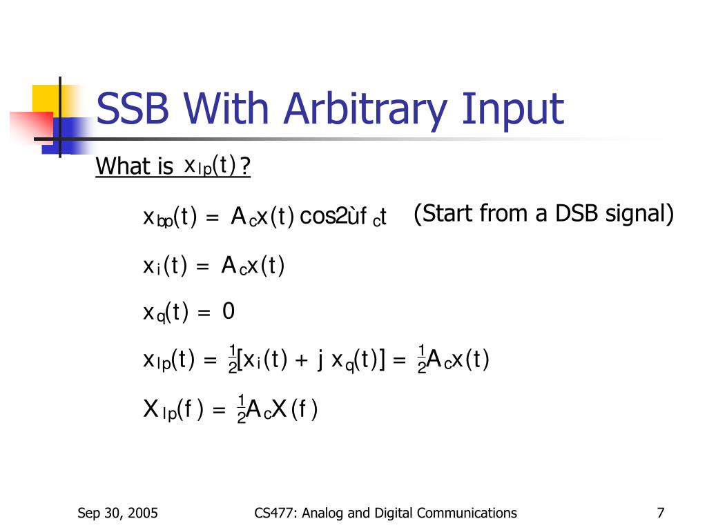 What is ? SSB With Arbitrary Input (Start from a DSB signal) CS477: Analog and Digital Communications