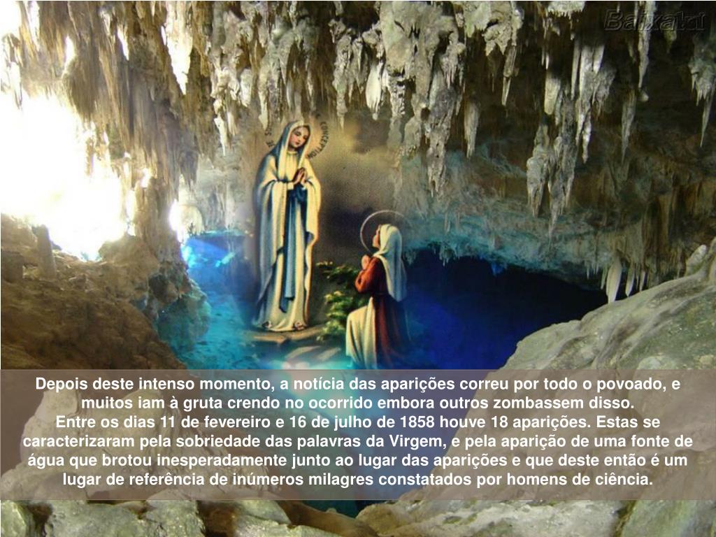 Em 11 de fevereiro de 1858, na vila francesa de Lourdes, às margens do rio Gave, nossa Mãe, Santa Maria manifestou de maneira direta e próxima seu profundo amor para conosco, aparecendo a uma menina de 14 anos, chamada Bernadete Soubirous. A história da aparição começa quando Bernadete, que nasceu em 7 de janeiro de 1844, saiu, junto com duas amigas, em busca de lenha na Pedra de Massabiele.