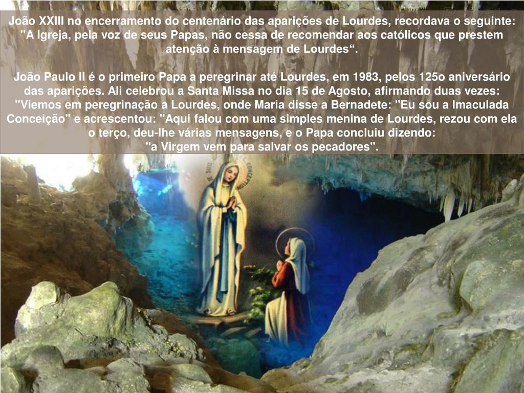 João XXIII no encerramento do centenário das aparições de Lourdes, recordava o seguinte: "A Igreja, pela voz de seus Papas, não cessa de recomendar aos católicos que prestem atenção à mensagem de Lourdes“. João Paulo II é o primeiro Papa a peregrinar até Lourdes, em 1983, pelos 125o aniversário das aparições. Ali celebrou a Santa Missa no dia 15 de Agosto, afirmando duas vezes: "Viemos em peregrinação a Lourdes, onde Maria disse a Bernadete: "Eu sou a Imaculada Conceição" e acrescentou: "Aqui falou com uma simples menina de Lourdes, rezou com ela o terço, deu-lhe várias mensagens, e o Papa concluiu dizendo: "a Virgem vem para salvar os pecadores".