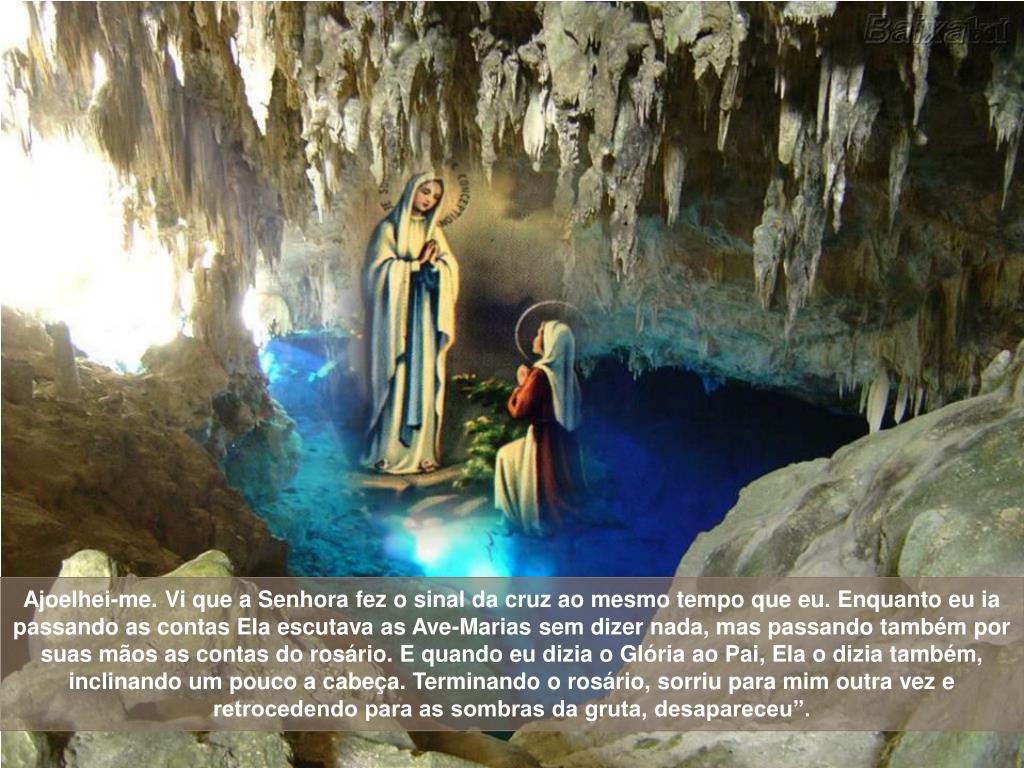 Ajoelhei-me. Vi que a Senhora fez o sinal da cruz ao mesmo tempo que eu. Enquanto eu ia passando as contas Ela escutava as Ave-Marias sem dizer nada, mas passando também por suas mãos as contas do rosário. E quando eu dizia o Glória ao Pai, Ela o dizia também, inclinando um pouco a cabeça. Terminando o rosário, sorriu para mim outra vez e retrocedendo para as sombras da gruta, desapareceu”.