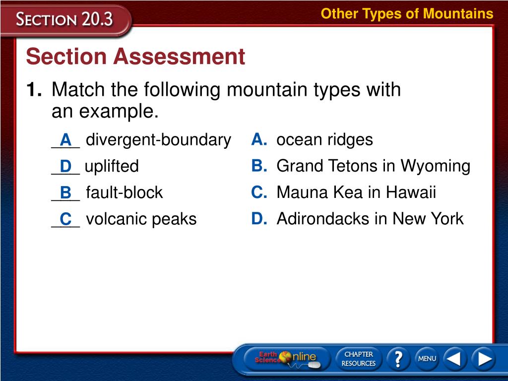Other Types of Mountains Section Assessment 1. Match the following mountain types with an example. ___ divergent-boundary ___ uplifted ___ fault-block ___ volcanic peaks A. ocean ridges B.Grand Tetons in Wyoming C.Mauna Kea in Hawaii D. Adirondacks in New York A D B C