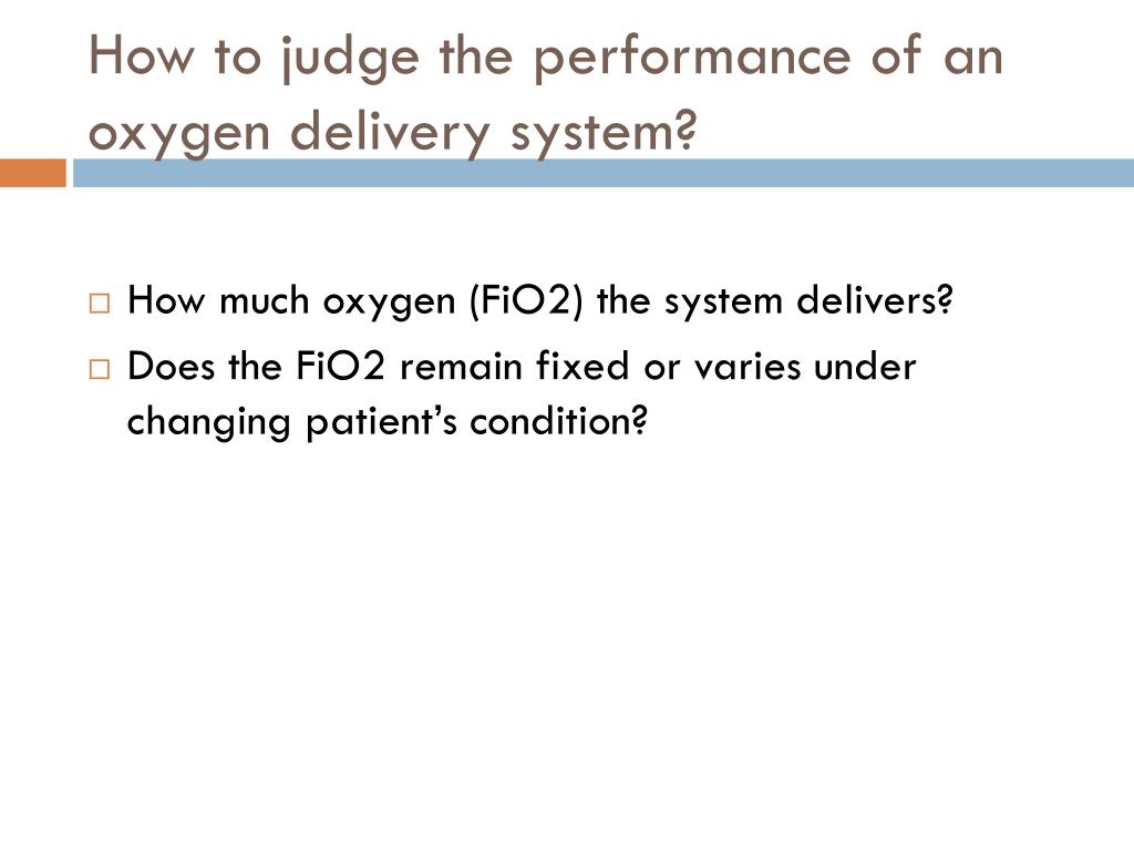 How to judge the performance of an oxygen delivery system? • How much oxygen (FiO2) the system delivers? • Does the FiO2 remain fixed or varies under changing patient’s condition?