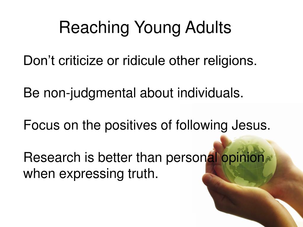 Reaching Young Adults Don’t criticize or ridicule other religions. Be non-judgmental about individuals. Focus on the positives of following Jesus. Research is better than personal opinion when expressing truth.