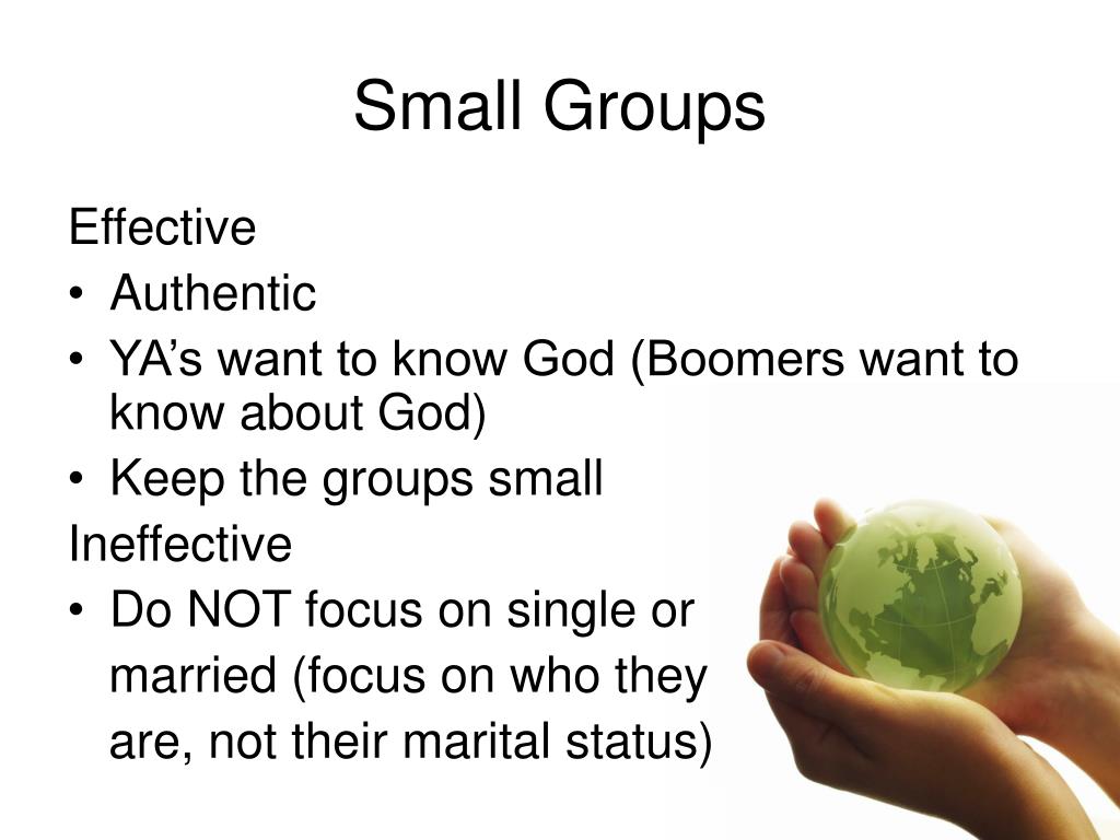 Small Groups Effective • Authentic • YA’s want to know God (Boomers want to know about God) • Keep the groups small Ineffective • Do NOT focus on single or married (focus on who they are, not their marital status)