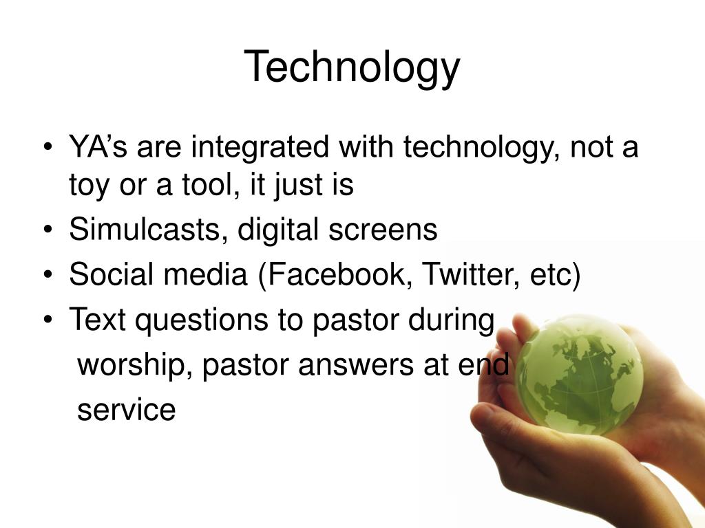 Technology • YA’s are integrated with technology, not a toy or a tool, it just is • Simulcasts, digital screens • Social media (Facebook, Twitter, etc) • Text questions to pastor during worship, pastor answers at end service
