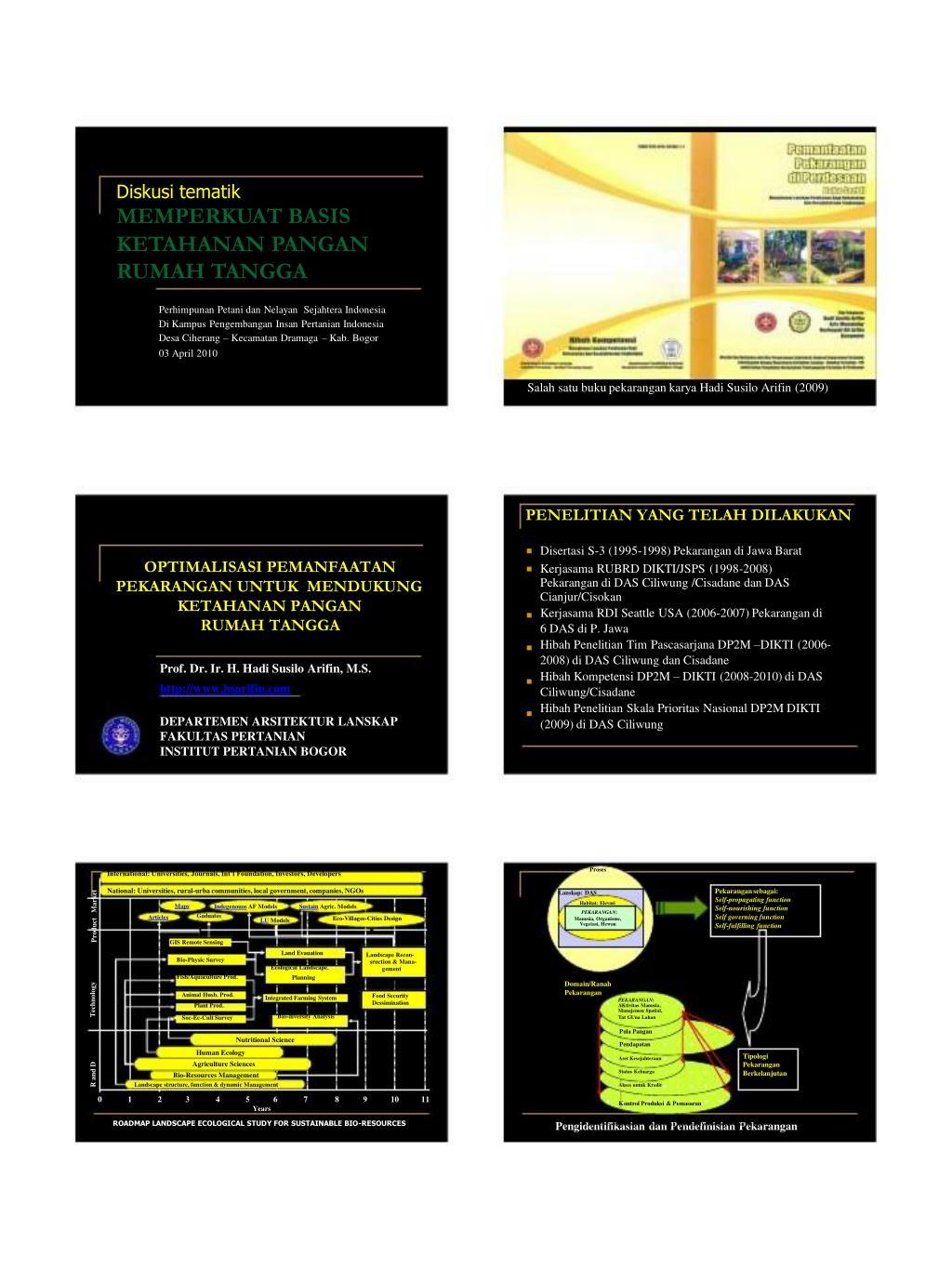 Diskusi tematik MEMPERKUAT BASIS KETAHANAN PANGAN RUMAH TANGGA Perhimpunan Petani dan Nelayan Sejahtera Indonesia Di Kampus Pengembangan Insan Pertanian Indonesia Desa Ciherang – Kecamatan Dramaga – Kab. Bogor 03 April 2010 Salah satu buku pekarangan karya Hadi Susilo Arifin (2009)