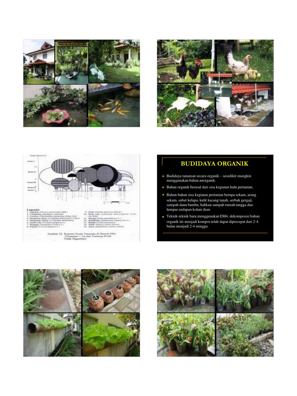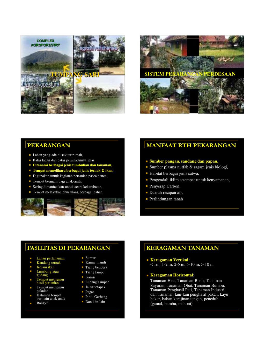 COMPLEX AGROFORESTRY HS Arifin Doc HS Arifin Doc HS Arifin Doc SISTEM PEKARANGAN PERDESAAN TUMPANG SARI HS Arifin Doc HS Arifin Doc PEKARANGAN MANFAAT RTH PEKARANGAN Lahan yang ada di sekitar rumah, Batas lahan dan batas pemilikannya jelas, Ditanami berbagai jenis tumbuhan dan tanaman, Tempat memelihara berbagai jenis ternak & ikan, Digunakan untuk kegiatan pertanian pasca panen, Tempat bermain bagi anak-anak, Sering dimanfaatkan untuk acara kekerabatan, Tempat melakukan daur ulang berbagai bahan Sumber pangan, sandang dan papan, Sumber plasma nutfah & ragam jenis biologi, Habitat berbagai jenis satwa, Pengendali iklim setempat untuk kenyamanan, Penyerap Carbon, Daerah resapan air, Perlindungan tanah FASILITAS DI PEKARANGAN KERAGAMAN TANAMAN Sumur Kamar mandi Tiang bendera Tiang lampu Garasi Lubang sampah Jalan setapak Pagar Pintu Gerbang Dan lain-lain Lahan pertanaman Kandang ternak Kolam ikan Lumbung atau gudang Tempat menjemur hasil pertanian Tempat menjemur pakaian Halaman tempat bermain anak-anak Bangku Keragaman Vertikal: < 1m; 1-2 m; 2-5 m; 5-10 m; > 10 m Keragaman Horizontal: Tanaman Hias, Tanaman Buah, Tanaman Sayuran, Tanaman Obat, Tanaman Bumbu, Tanaman Penghasil Pati, Tanaman Industri, dan Tanaman lain-lain penghasil pakan, kayu bakar, bahan kerajinan tangan, peneduh (gamal, bambu, mahoni)