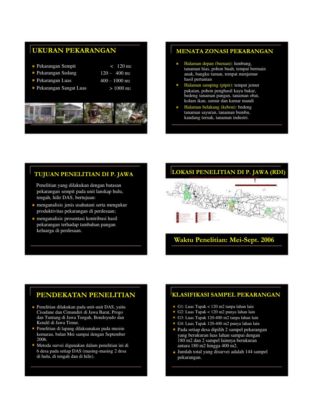 UKURAN PEKARANGAN MENATA ZONASI PEKARANGAN Halaman depan (buruan): lumbung, tanaman hias, pohon buah, tempat bermain anak, bangku taman, tempat menjemur hasil pertanian Halaman samping (pipir): tempat jemur pakaian, pohon penghasil kayu bakar, < 120 m2 120 – 400 m2 400 – 1000 m2 > 1000 m2 Pekarangan Sempit Pekarangan Sedang Pekarangan Luas Pekarangan Sangat Luas bedeng tanaman pangan, tanaman obat, kolam ikan, sumur dan kamar mandi Halaman belakang (kebon): bedeng tanaman sayuran, tanaman bumbu, kandang ternak, tanaman industri. LOKASI PENELITIAN DI P. JAWA (RDI) NATIONAL RECOMMENDED CROP ZONE ON STUDY SITES TUJUAN PENELITIAN DI P. JAWA Penelitian yang dilakukan dengan batasan 0 20 40 80 120 280 121 62 2 S 10 30 60 100 200 360 Km 7 7 pekarangan sempit pada unit lanskap hulu, 2 2 48 85 48 2 90 48 120 120 90 3108 2 2 90 3 3 3 120 3 121 90 108 2 tengah, hilir DAS, bertujuan: 108 3 108 5 3 3 99 2 99 2 48 48 48 2 108 5 85 85 3 48 9 108 116 4 2 98 252 52 98 107 W1073 3 25 107983 107 121 menganalisis jenis usahatani serta mengukur 120 107 3 3 2 107 3 120 2 4 S 119 54 2 4 9 53 66 9 96 96 53 produktivitas pekarangan di perdesaan; 121 120 120 121 120 53 S S 2 120 120 4 2 Legend: 1 Rice Paddy 2 Rice Paddy - Cereal/Horticulture low land humid 66 52 53 Manggis/Salak Palm/Durian/Kelengkeng Manggis/Salak Palm/Durian/Rambutan 107 108 Tea/Cinnamon Tea/Cinnamon/Cinine 2 3 Rice Paddy - Cereal/Horticulture high land humid 54 Woodland Rambutan/Durian/Clove/Melinjo 116 4 Rice Paddy - Cereal/Horticulture low land dry 62 Coconut/Cacao 120 Forest used 45 5 7 9 25 45 Rice Paddy - Cereal/Horticulture high land dry Upland Paddy/Maize/Chillies Upland Paddy/Maize/Ground nut/Chillies/Melon/Water Melon Maize/Sweet potato/Potato/Tobacco Manggo/Salak Palm /Grape 66 85 90 96 98 121 119 S W menganalisis prosentasi kontribusi hasil Arabica Coffee/Orange/Avocado Clove/Pala/Woods Clove/Pala/Rambutan/Salak Palm/Durian Clove/Melinjo/Rambutan/Durian Rubber Conservation Forest Fishpond Settlement Water Body (lake, dam, swampy land) 48 Manggis/Rambutan/Salak Palm/Durian 99 Rubber/Coconut oil pekarangan terhadap tambahan pangan keluarga di perdesaan. Waktu Penelitian: Mei-Sept. 2006 PENDEKATAN PENELITIAN KLASIFIKASI SAMPEL PEKARANGAN G1: Luas Tapak < 120 m2 tanpa lahan lain G2: Luas Tapak < 120 m2 punya lahan lain G3: Luas Tapak 120-400 m2 tanpa lahan lain G4: Luas Tapak 120-400 m2 punya lahan lain Pada setiap desa dipilih 2 sampel pekarangan yang berukuran luas lahan sampai dengan 180 m2 dan 2 sampel lainnya berukuran antara 180 m2 hingga 400 m2. Jumlah total yang disurvei adalah 144 sampel pekarangan. Penelitian dilakukan pada unit-unit DAS, yaitu Cisadane dan Cimandiri di Jawa Barat, Progo dan Tuntang di Jawa Tengah, Bondoyudo dan Kendil di Jawa Timur. Penelitian di lapang dilaksanakan pada musim kemarau, bulan Mei sampai dengan September 2006. Metoda survei digunakan dalam penelitian ini di 6 desa pada setiap DAS (masing-masing 2 desa di hulu, di tengah dan di hilir).