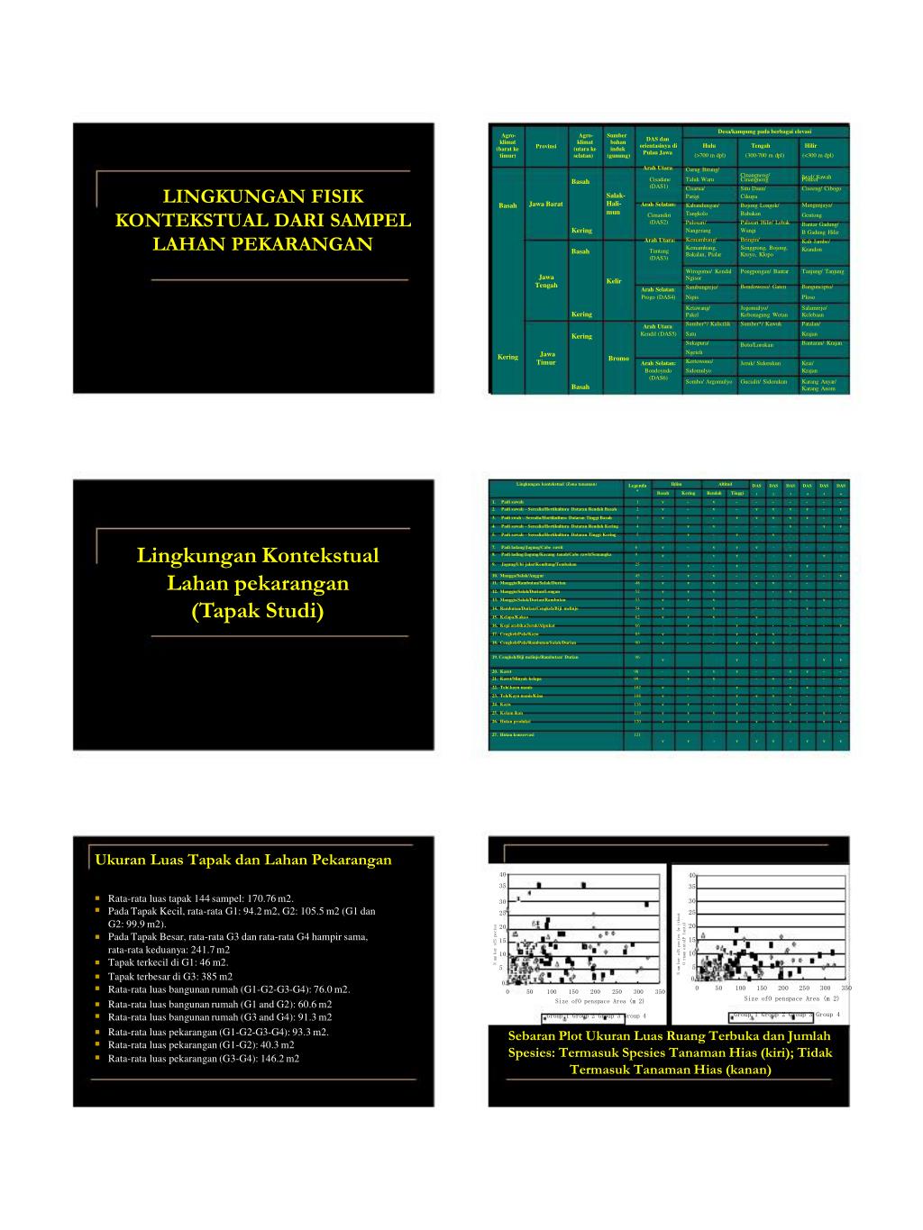 Desa/kampung pada berbagai elevasi Hulu Tengah Hilir (>700 m dpl) (300-700 m dpl) (<300 m dpl) Curug Bitung/ Cinangneng/ Iwul/ Sawah Agro- klimat (barat ke timur) Agro- klimat (utara ke selatan) Sumber bahan induk (gunung) DAS dan orientasinya di Pulau Jawa Arah Utara: Provinsi Cisadane (DAS1) Arah Selatan: Cimandiri (DAS2) Arah Utara: Tuntang (DAS3) Taluk Waru Cisarua/ Parigi Kabandungan/ Tangkolo Pulosari/ Nangerang Kemambang/ Kemambang, Bakalan, Pialar Cinangneng Situ Daun/ Cikupa Bojong Longok/ Babakan Palasari Hilir/ Lebak Wangi Bringin/ Senggrong, Bojong, Kroyo, Klopo Poncol Ciseeng/ Cibogo Mangunjaya/ Gentong Bantar Gadung/ B Gadung Hilir Kali Jambe/ Krandon Basah Kering Basah LINGKUNGAN FISIK KONTEKSTUAL DARI SAMPEL LAHAN PEKARANGAN Salak- Hali- mun Jawa Barat Basah Wirogomo/ Kendal Ngisor Sambungrejo/ Pongpongan/ Bantar Bondowoso/ Gaten Tanjung/ Tanjung Banguncipto/ Jawa Tengah Kelir Arah Selatan: Progo (DAS4) Nipis Ploso Ketawang/ Pakel Sumber*/ Kalicilik Jogomulyo/ Kebonagung Wetan Sumber*/ Kawuk Salamrejo/ Kelebaan Patalan/ Kering Arah Utara: Kendil (DAS5) Satu Sukapura/ Krajan Bantaran/ Krajan Kering Boto/Lorokan Ngeteh Kertowono/ Jawa Timur Kering Bromo Arah Selatan: Jeruk/ Sidorukun Krai/ Bondoyudo Sidomulyo Krajan (DAS6) Sombo/ Argomulyo Gucialit/ Sidorukun Karang Anyar/ Karang Anom Basah Lingkungan kontekstual (Zona tanaman) Iklim Altitud Legenda DAS DAS DAS DAS DAS DAS * Basah Kering Rendah Tinggi 1 2 3 4 5 6 1. 2. 3. 4. 5. Padi sawah Padi sawah – Serealia/Hortikultura Dataran Rendah Basah Padi swah – Serealia/Hortikultura Dataran Tinggi Basah Padi sawah – Serealia/Hortikultura Dataran Rendah Kering Padi sawah – Serealia/Hortikultura Dataran Tinggi Kering 1 2 3 4 5 v v v - - - - - v v v v - v - - - v - v - v v - - - v v - v - v v v - - v v - - - - - v - - v - v - Lingkungan Kontekstual 7. 8. 9. Padi ladang/Jagung/Cabe rawit Padi lading/Jagung/Kacang tanah/Cabe rawit/Semangka Jagung/Ubi jalar/Kendtang/Tembakau 6 9 25 v v - - - v v v - v v v v - - - - - - v - - - v - v - - - - Lahan pekarangan (Tapak Studi) 10. Mangga/Salak/Anggur 11. Manggis/Rambutan/Salak/Durian 12. Manggis/Salak/Durian/Longan 13. Manggis/Salak/Durian/Rambutan 14. Rambutan/Durian/Cengkeh/Biji melinjo 15. Kelapa/Kakao 16. Kopi arabika/Jeruk/Alpukat 17. Cengkeh/Pala/Kayu 18. Cengkeh/Pala/Rambutan/Salak/Durian 45 48 52 53 54 62 66 85 90 - v v v v v - v v v v v v - v v - - v v v v v v - - - - - - - - - v v v - v - - - v - v v - v - - - - - v v - - v - - - - - - - - - - v - - - - - - - v - - - - - v - - - - - v - - 19. Cengkeh/Biji melinjo/Rambutan/ Durian 96 v v - - - - v v 20. Karet 21. Karet/Minyak kelapa 22. Teh/.kayu manis 23. Teh/Kayu manis/Kina 24. Kayu 25. Kolam ikan 26. Hutan produksi 98 99 107 108 116 119 120 - - v v v v v v v - - v v v v v - - - v - v - v v v v v - - - v - - v - v - v - - v v - v - v - v v - v - - - - - - - - - v v - - - - - - v 27. Hutan konservasi 121 v v - v v v - v v v Ukuran Luas Tapak dan Lahan Pekarangan 40 35 40 35 Rata-rata luas tapak 144 sampel: 170.76 m2. Pada Tapak Kecil, rata-rata G1: 94.2 m2, G2: 105.5 m2 (G1 dan G2: 99.9 m2). Pada Tapak Besar, rata-rata G3 dan rata-rata G4 hampir sama, rata-rata keduanya: 241.7 m2 Tapak terkecil di G1: 46 m2. 30 25 20 15 10 5 30 25 20 15 10 5 O rnam entalP lants) N um ber ofS pecies (w ithout N um ber ofS pecies Tapak terbesar di G3: 385 m2 Rata-rata luas bangunan rumah (G1-G2-G3-G4): 76.0 m2. 0 0 0 50 100 150 200 250 300 350 0 50 100 150 200 250 300 350 Size ofO penspace Area (m 2) Group 1 Group 2 Group 3 Group 4 Size ofO penspace Area (m 2) Group 1 Group 2 Group 3 Group 4 Rata-rata luas bangunan rumah (G1 and G2): 60.6 m2 Rata-rata luas bangunan rumah (G3 and G4): 91.3 m2 Rata-rata luas pekarangan (G1-G2-G3-G4): 93.3 m2. Rata-rata luas pekarangan (G1-G2): 40.3 m2 Rata-rata luas pekarangan (G3-G4): 146.2 m2 Sebaran Plot Ukuran Luas Ruang Terbuka dan Jumlah Spesies: Termasuk Spesies Tanaman Hias (kiri); Tidak Termasuk Tanaman Hias (kanan)