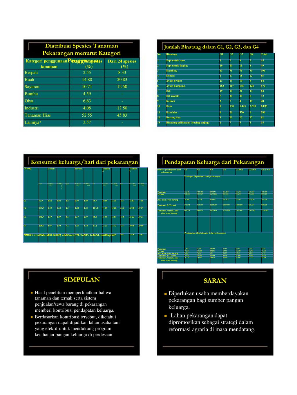 Distribusi Spesies Tanaman Pekarangan menurut Kategori Jumlah Binatang dalam G1, G2, G3, dan G4 Kategori penggunaanPenggunaan Dari 196 spesies Dari 24 spesies tanaman Berpati Buah Sayuran Bumbu Obat Industri Tanaman Hias Lainnya* (%) 2.55 14.80 10.71 4.59 6.63 4.08 52.55 3.57 (%) 8.33 20.83 12.50 - - 12.50 45.83 - Konsumsi keluarga/hari dari pekarangan RDA = recommended dietary allowance; To Total = to total consumption SIMPULAN Pendapatan Keluarga dari Pekarangan SARAN Hasil penelitian memperlihatkan bahwa tanaman dan ternak serta sistem penjualan/sewa barang di pekarangan memberi kontribusi pendapatan keluarga. Diperlukan usaha memberdayakan pekarangan bagi sumber pangan keluarga. Lahan pekarangan dapat dipromosikan sebagai strategi dalam reformasi agraria di masa mendatang. Berdasarkan kontribusi tersebut, diketahui pekarangan dapat dijadikan lahan usaha tani yang efektif untuk mendukung program ketahanan pangan keluarga di perdesaan.