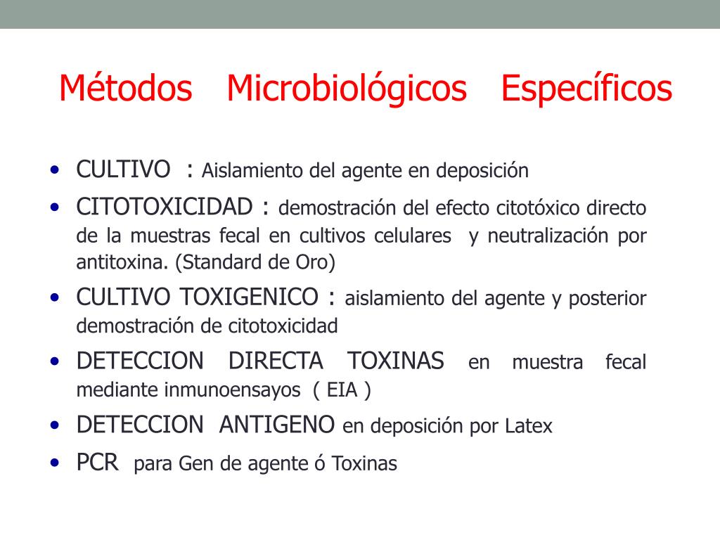 Métodos Microbiológicos Específicos • CULTIVO : Aislamiento del agente en deposición • CITOTOXICIDAD : demostración del efecto citotóxico directo de la muestras fecal en cultivos celulares y neutralización por antitoxina. (Standard de Oro) • CULTIVO TOXIGENICO : aislamiento del agente y posterior demostración de citotoxicidad • DETECCION DIRECTA TOXINAS en muestra fecal mediante inmunoensayos ( EIA ) • DETECCION ANTIGENO en deposición por Latex • PCR para Gen de agente ó Toxinas