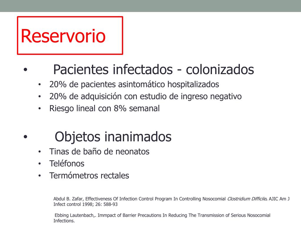 Reservorio • Pacientes infectados - colonizados • 20% de pacientes asintomático hospitalizados • 20% de adquisición con estudio de ingreso negativo • Riesgo lineal con 8% semanal • Objetos inanimados • Tinas de baño de neonatos • Teléfonos • Termómetros rectales Abdul B. Zafar, Effectiveness Of Infection Control Program In Controlling Nosocomial Clostridium Difficile. AJIC Am J Infect control 1998; 26: 588-93 Ebbing Lautenbach,. Immpact of Barrier Precautions In Reducing The Transmission of Serious Nosocomial Infections.