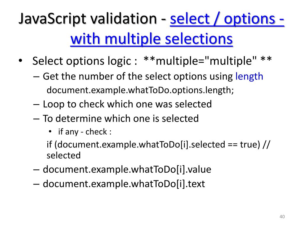 JavaScript validation - select / options - with multiple selections • Select options logic : **multiple="multiple" ** • Get the number of the select options using length document.example.whatToDo.options.length; • Loop to check which one was selected • To determine which one is selected • if any - check : if (document.example.whatToDo[i].selected == true) // selected • document.example.whatToDo[i].value • document.example.whatToDo[i].text