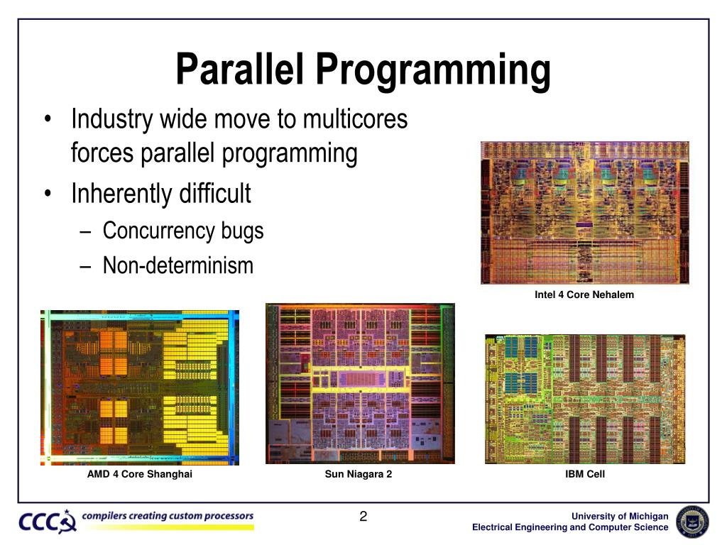 Parallel Programming • Industry wide move to multicores forces parallel programming • Inherently difficult • Concurrency bugs • Non-determinism Intel 4 Core Nehalem AMD 4 Core Shanghai Sun Niagara 2 IBM Cell 2