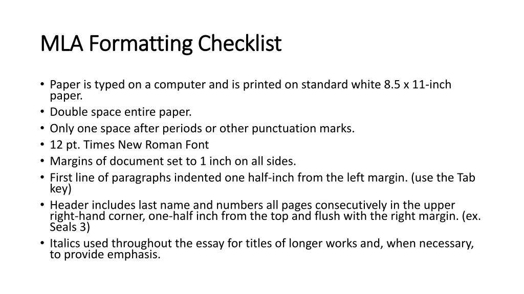MLA Formatting Checklist • Paper is typed on a computer and is printed on standard white 8.5 x 11-inch paper. • Double space entire paper. • Only one space after periods or other punctuation marks. • 12 pt. Times New Roman Font • Margins of document set to 1 inch on all sides. • First line of paragraphs indented one half-inch from the left margin. (use the Tab key) • Header includes last name and numbers all pages consecutively in the upper right-hand corner, one-half inch from the top and flush with the right margin. (ex. Seals 3) • Italics used throughout the essay for titles of longer works and, when necessary, to provide emphasis.