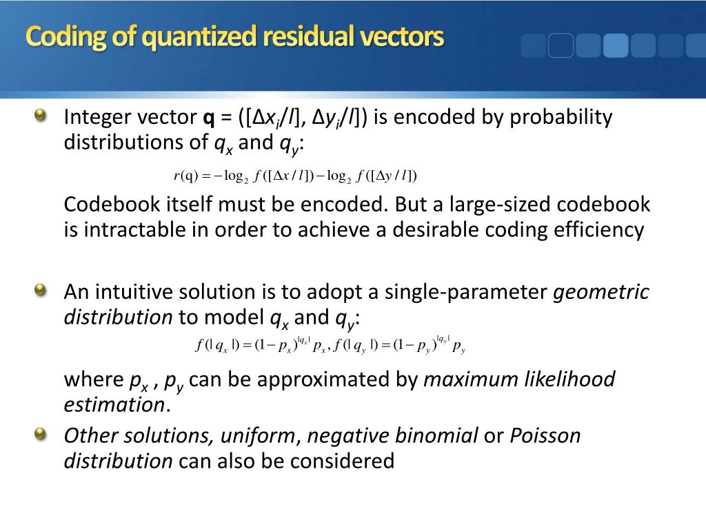 Coding of quantized residual vectors • Integer vector q = ([Δxi/l], Δyi/l]) is encoded by probability distributions of qx and qy: Codebook itself must be encoded. But a large-sized codebook is intractable in order to achieve a desirable coding efficiency • An intuitive solution is to adopt a single-parameter geometric distribution to model qx and qy: where px,pycan be approximated by maximum likelihood estimation. • Other solutions, uniform, negative binomial or Poisson distribution can also be considered