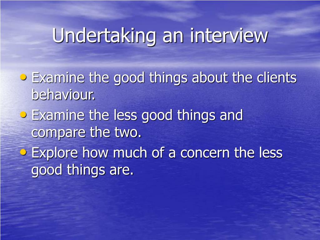Undertaking an interview • Examine the good things about the clients behaviour. • Examine the less good things and compare the two. • Explore how much of a concern the less good things are.